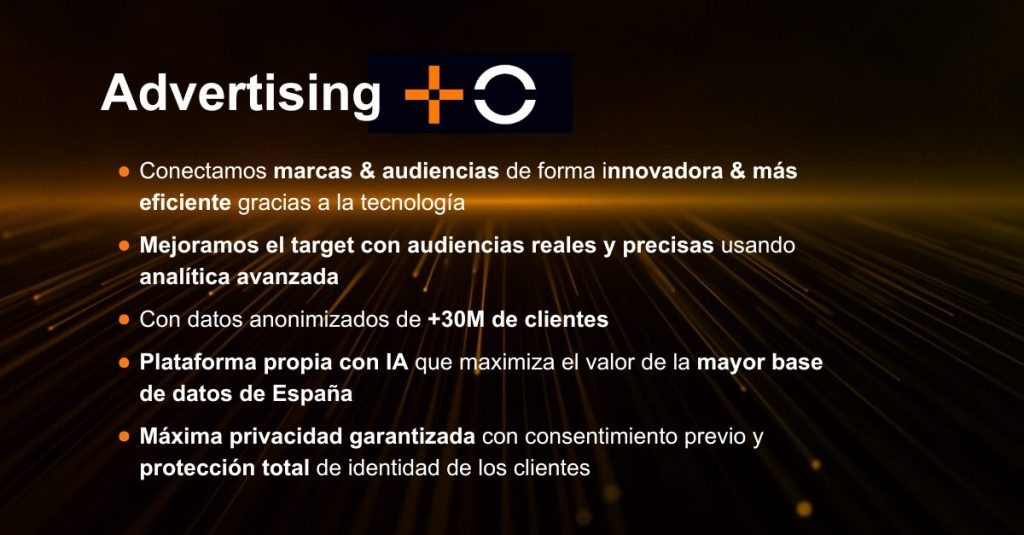Para alcanzar este objetivo de la manera más eficiente, MasOrange dispone de una nueva plataforma tecnológíca propia de primer nivel capaz de analizar 24.000 millones de datos en 2 segundos, que, combinada con el talento tecnológico de la Compañía, la base de datos más relevante del mercado, la lA y la analítica avanzada, ofrece perfiles hipersegmentados a los anunciantes alineados con los intereses de cada marca.